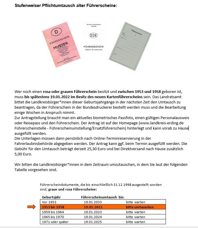 - Wer noch einen rosa oder grauen Führerschein besitzt und zwischen 1953 und 1958 geboren ist, hätte diesen bis spätestens 19.01.2022 in den neuen Kartenführerschein umtauschen lassen sollen.