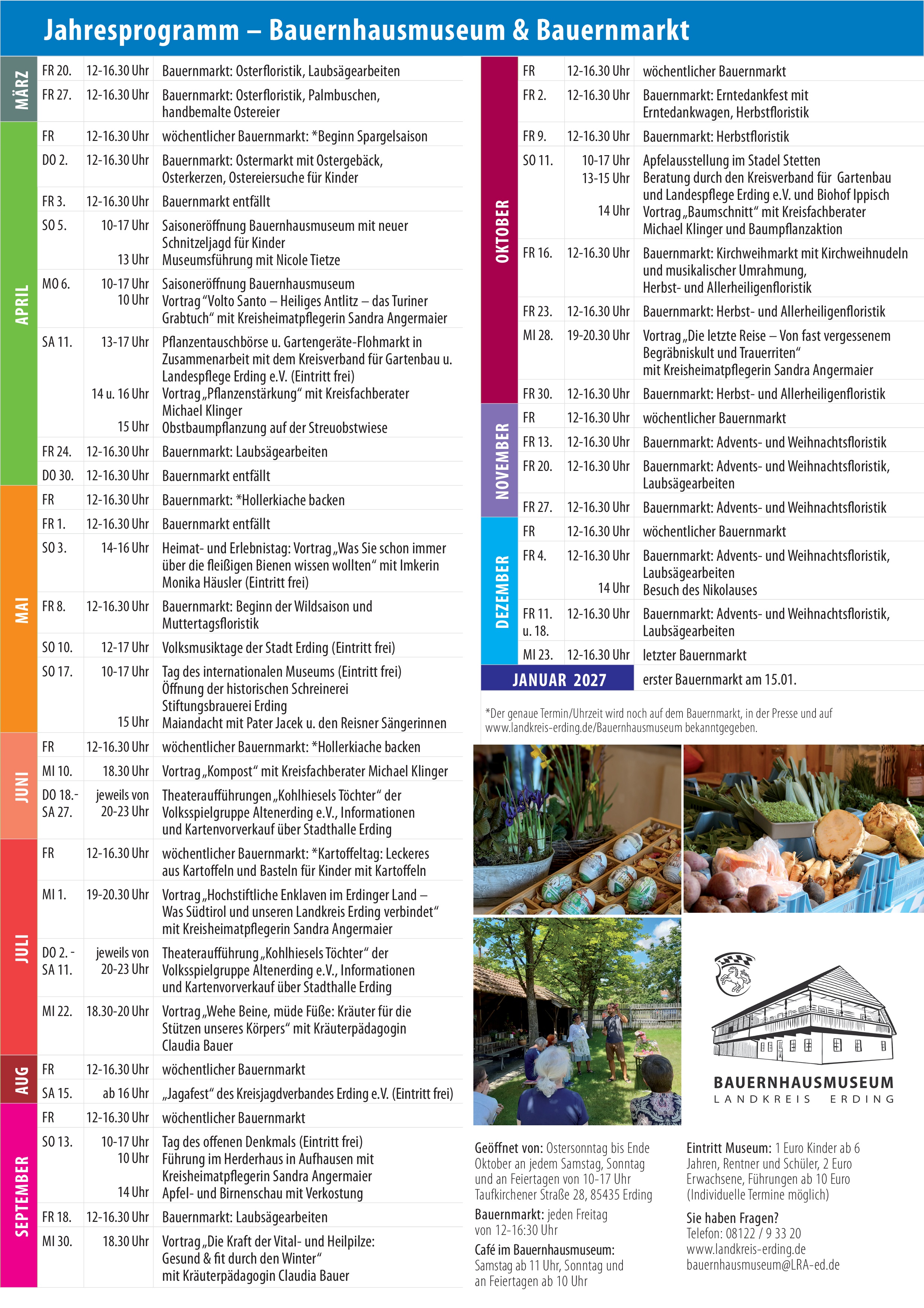 Der Bauernmarkt auf dem Gelände des Museums ist jeden Freitag von 12 – 16:30 Uhr geöffnet. Im neuen Eingangs- und Marktgebäude bieten Landwirtinnen und Landwirte aus dem Landkreis Erding regionale und saisonale Waren und Speisen an. Die Empore als auch der kleine Biergarten laden zum Verweilen ein.